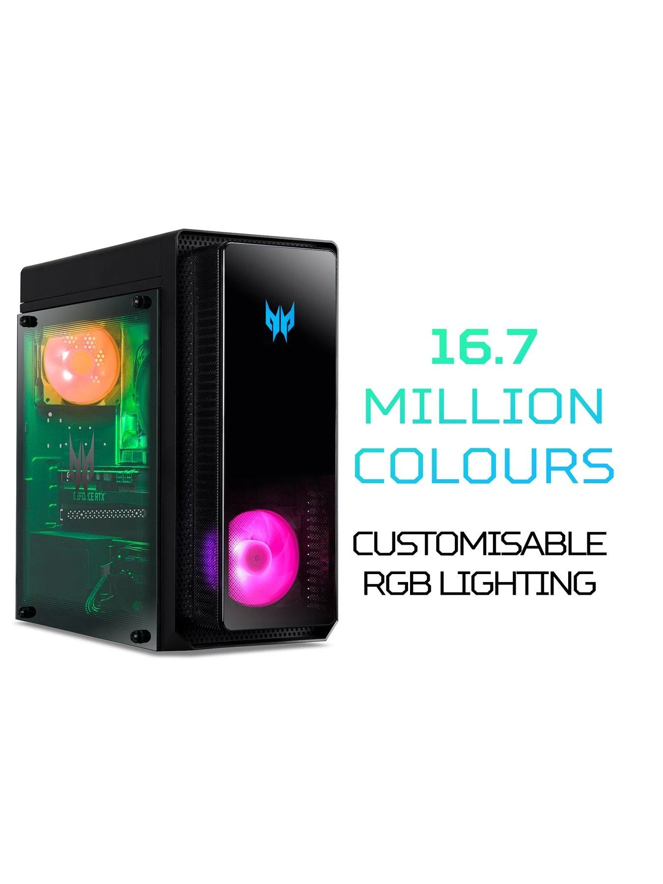 There’s an RGB Predator FrostBlade intake fan at the front (visible through the transparent front panel) and a second FrostBlade exhaust fan at the rear. Combined with the PredatorSense control centre, you can keep your PC running nice and cool no matter how intense the gaming session. You can also manage the lighting effects for the two RGB fans – pick a pattern that fits your style, your current game or even the song that’s playing.