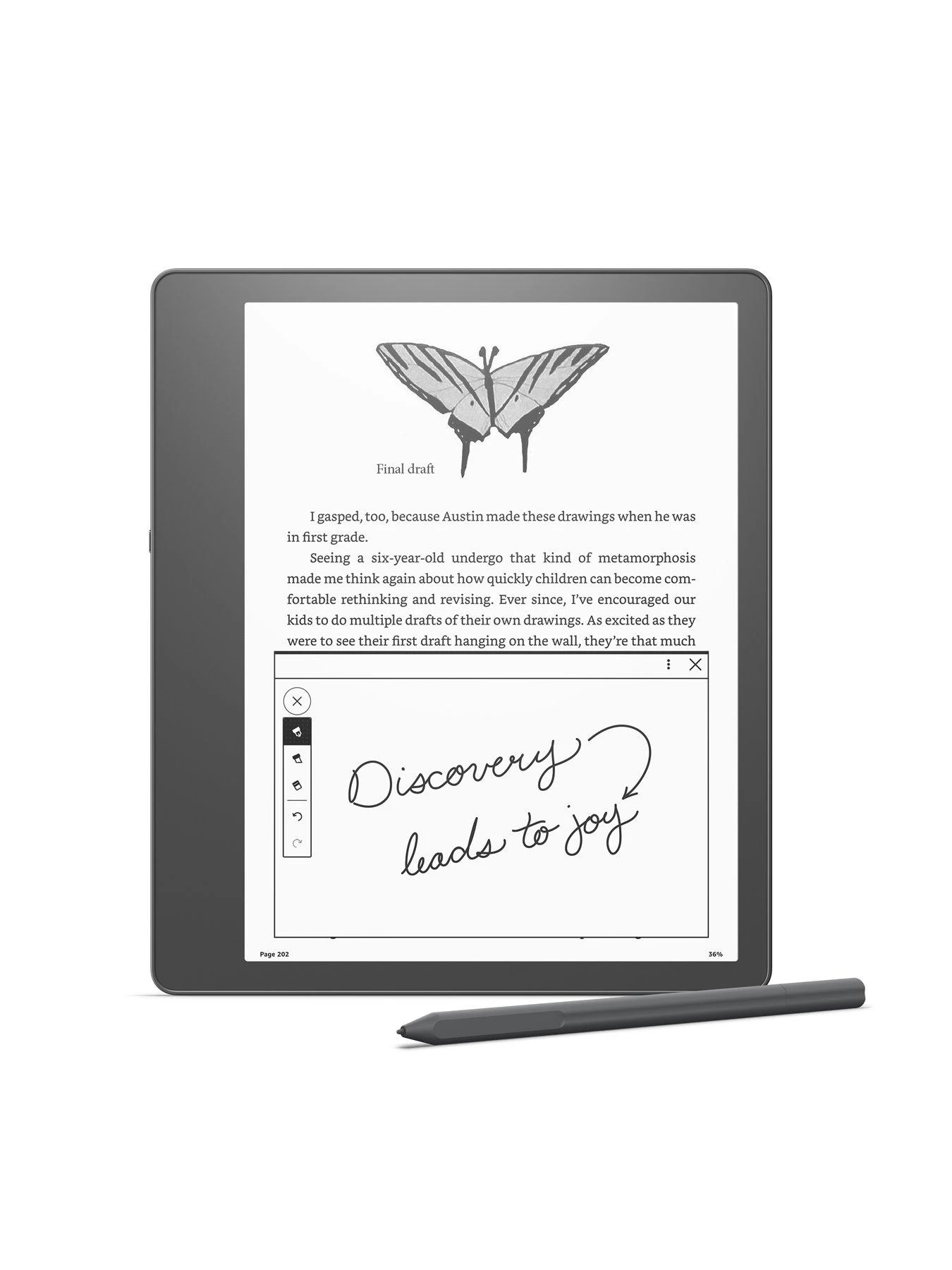 With a 10.2-inch, 300 ppi glare-free Paperwhite display, Kindle Scribe is perfect for reading and writing, even in direct sunlight. The large display gives you room to take notes or write a diary entry and makes it easy to adjust font size and margin width for improved reading comfort. Writing on Kindle Scribe feels like writing on paper. From the natural grip of the pen in your hand to the sound you hear when you write, Kindle Scribe’s surface is crafted for the best possible reading and writing experience.