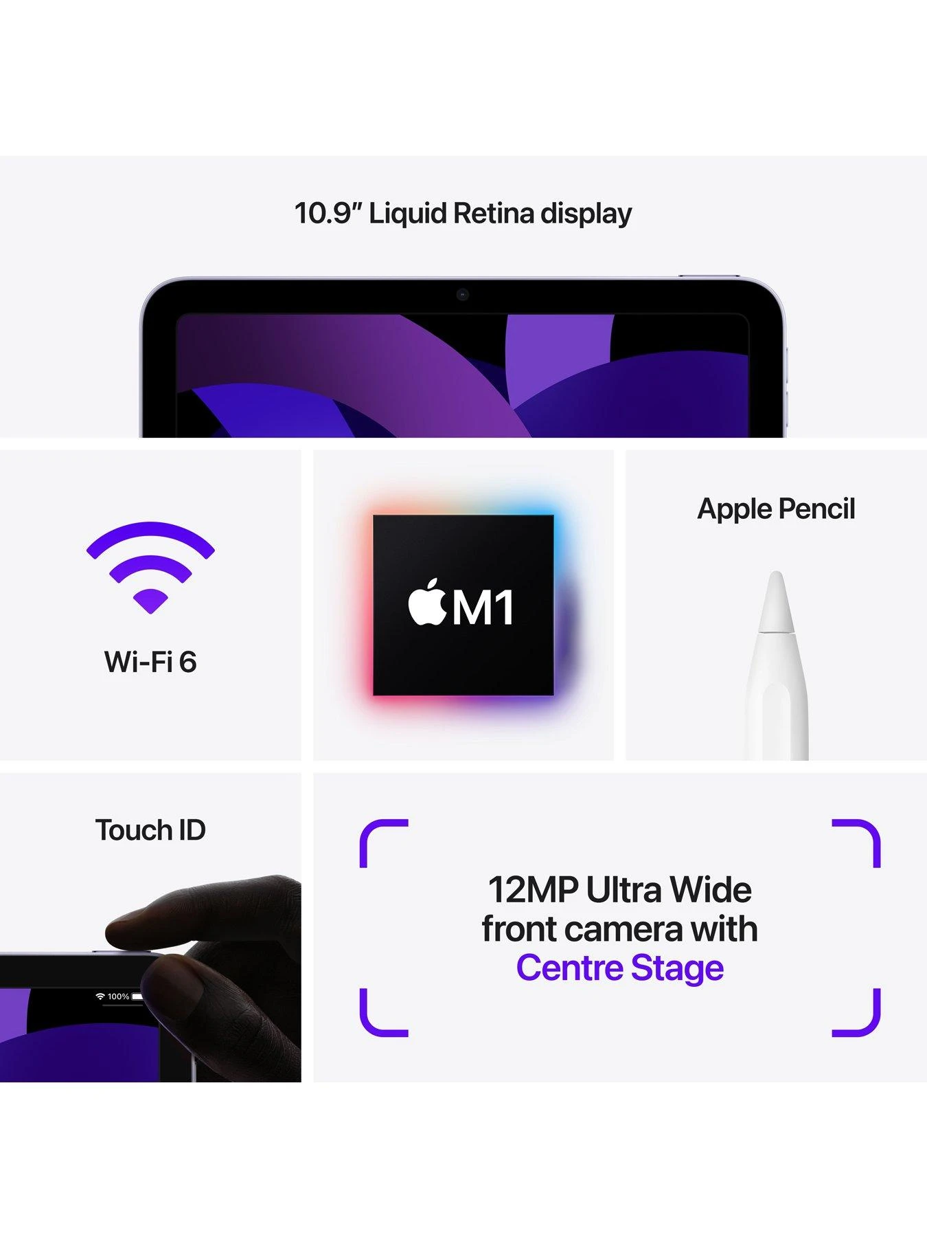 iPad Air. With an immersive 10.9-inch Liquid Retina display.1 The breakthrough Apple M1 chip delivers faster performance, making iPad Air a creative and mobile gaming powerhouse. Featuring Touch ID, advanced cameras and Wi-Fi 6, USB-C, and support for Magic Keyboard and Apple Pencil (2nd generation).2