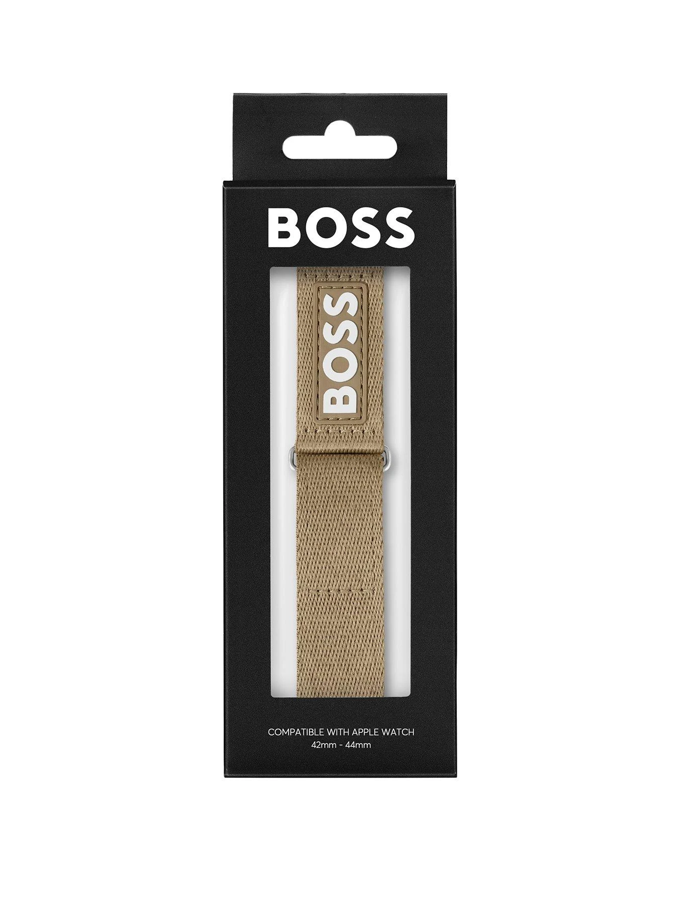 BOSS gents #TIDE Camel Ocean-Bound Apple watch strap. Featuring a camel coloured ocean-bound plastic strap with Velcro closure, stitched silicone piece with white BOSS logo and stainless steel lugs. Made exclusively for use with the 42mm and 44mm Apple watch.