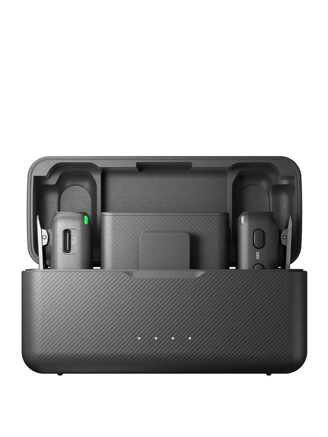- Design makes it ultra-portable and accessible. Two transmitters and the receiver are pre-linked, charged, and securely stored in the charging case.