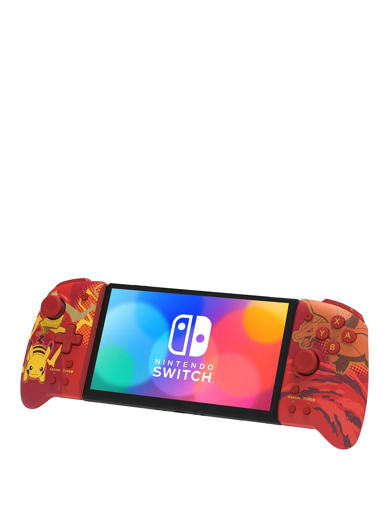 Enjoy the full-size controller experience in handheld mode with the HORI Split Pad Pro (Charizard & Pikachu)! Featuring full-size analog sticks, a precision D-pad, and large shoulder buttons, designed for comfort and accuracy, even during marathon gaming sessions. Advanced features include assignable rear triggers, turbo functionality, and more. Perfect for a wide range of genres available on the Nintendo Switch. Enjoy a new gaming experience with the Split Pad Pro! (Not a wireless controller – only for handheld mode. Does not include motion controls, HD rumble, NFC, or IR Camera.) Officially Licensed by Nintendo & Pok????mon.