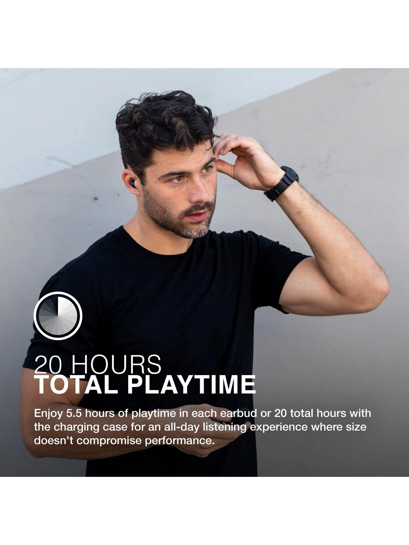 Enjoy 5.5 hours of playtime in each earbud or 20 total hours with the compact charging case for an all-day listening experience where size doesn’t compromise performance.