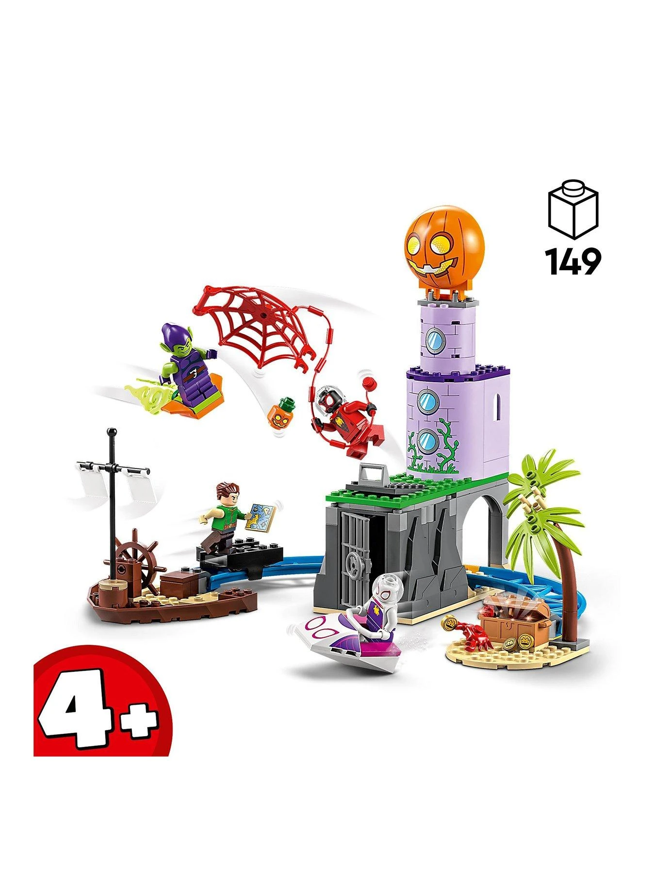 The Spidey and His Amazing Friends building toy for preschool kids includes 4 minifigures – Miles Morales, Ghosty, Sandman and Green Goblin – plus a buildable pirate shipwreck, a railway to transport stolen treasure, a cave that doubles as a jail, the lighthouse headquarters of Green Goblin and numerous accessories. A Starter Brick wall element gives youngsters the confidence to build and reconfigure the set. Simple instructions are provided in the form of a colourful picture-story guide and, for added digital fun, the LEGO Builder app features intuitive zoom and rotate tools that let kids visualise their model as they build.