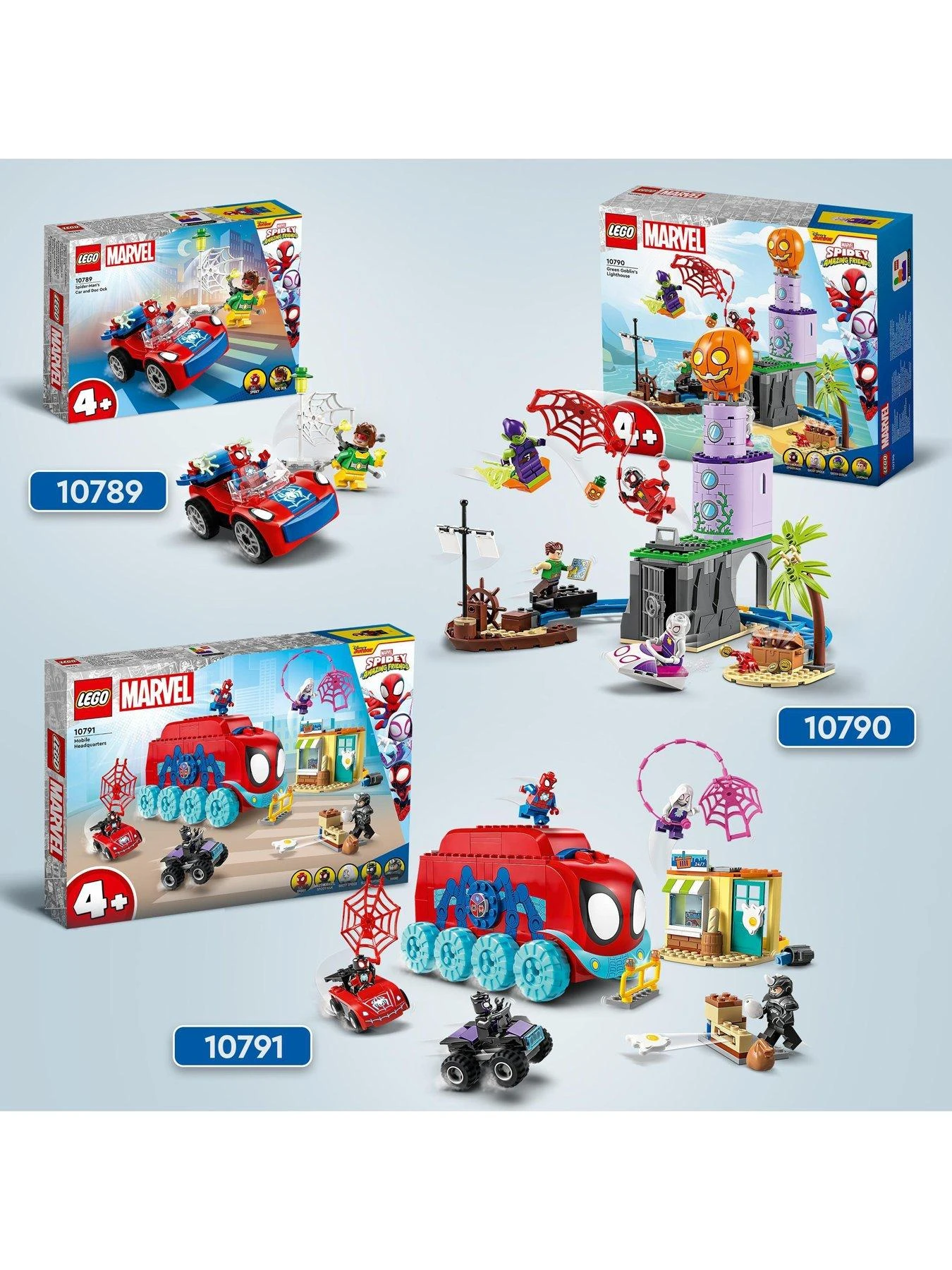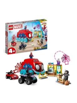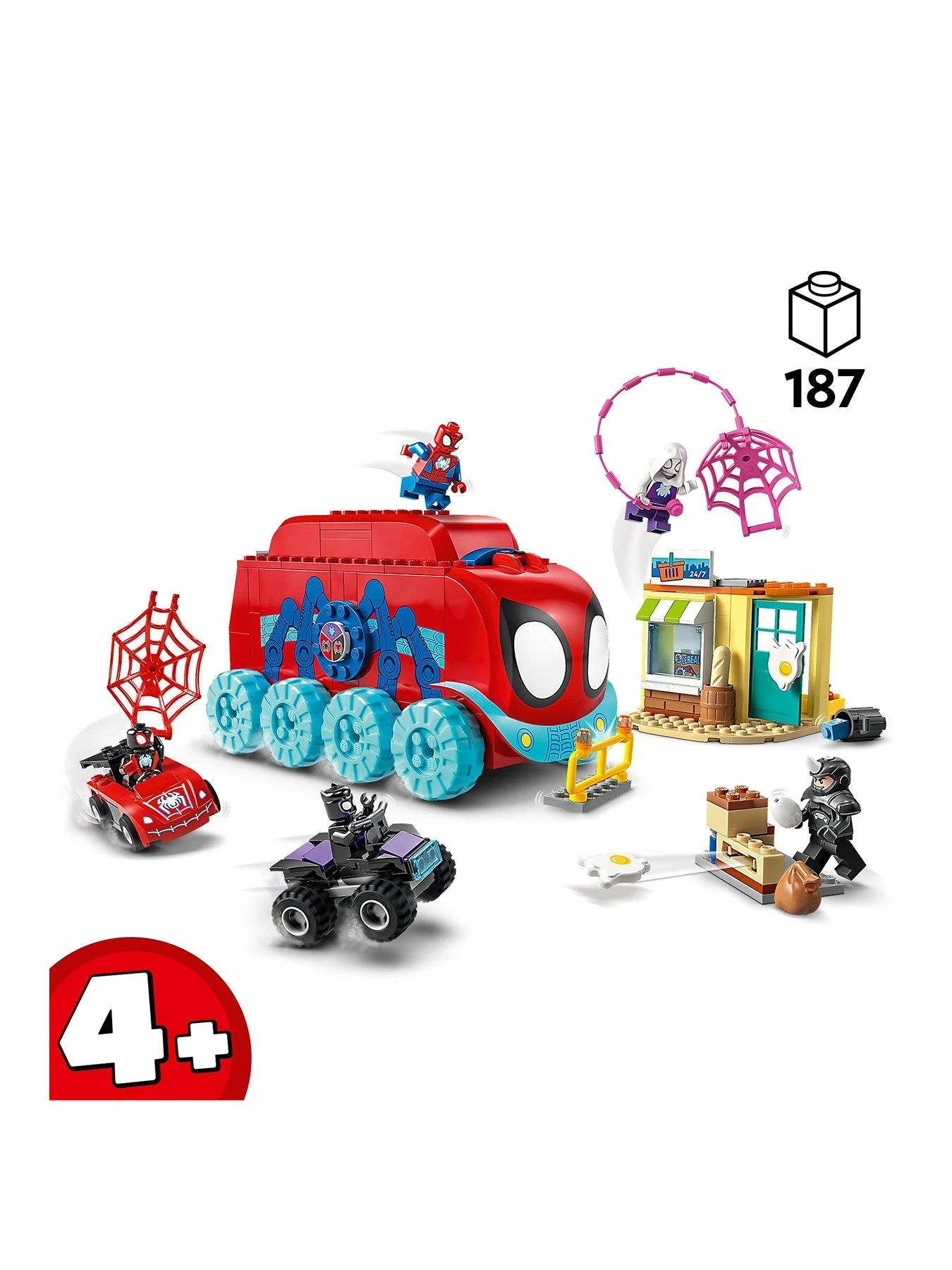 This LEGO Spidey and His Amazing Friends 4+ set features a buildable headquarters truck toy, car, quad bike, 5 minifigures and a small shop build
