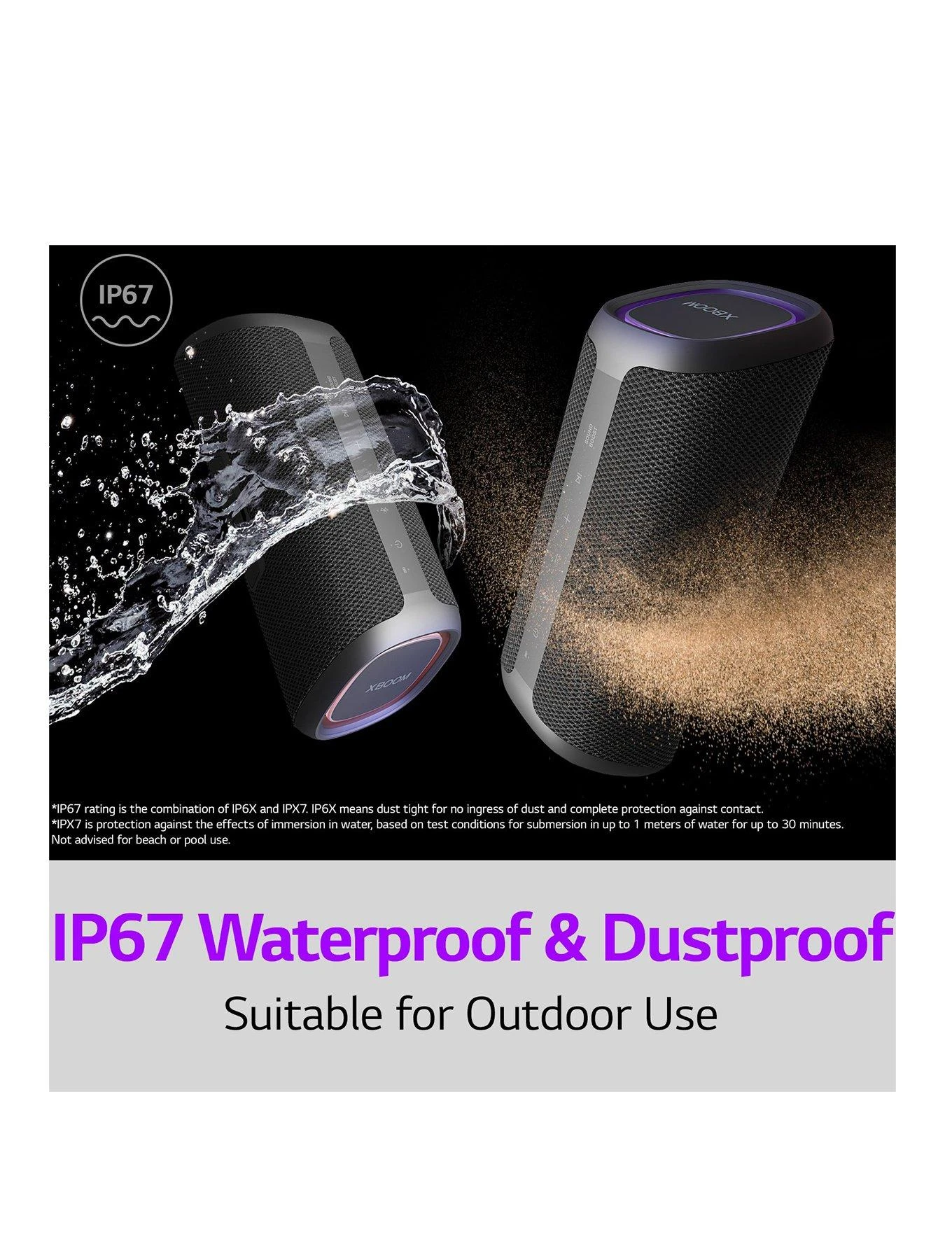 You can go anywhere with your LG XBOOM Go and get the party started any time, any place – including the great outdoors. With IP67, it can withstand water and dust so you never have to worry about keeping the music going.