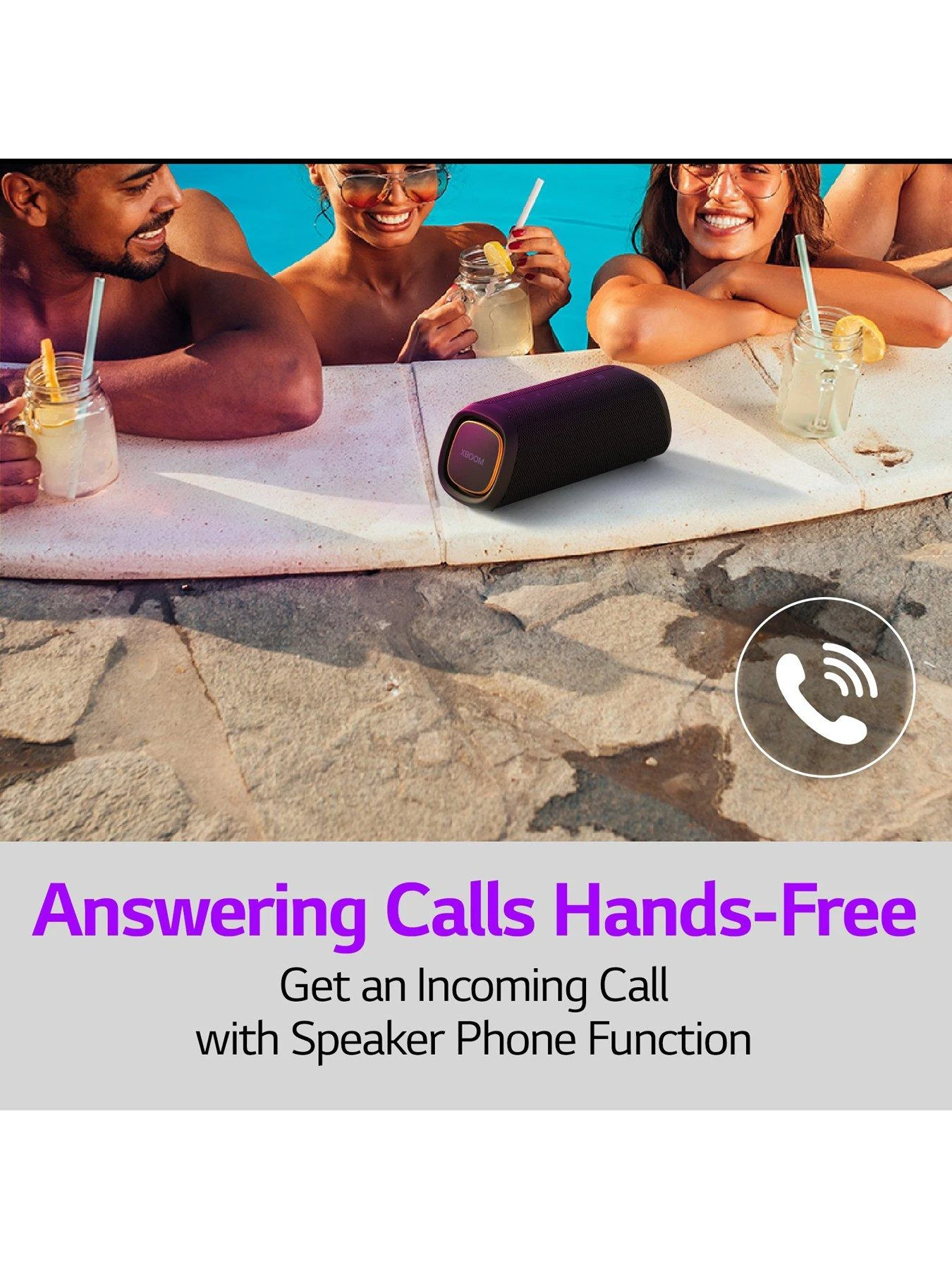 The LG XBOOM Go makes sure you get an incoming call while the music plays by switching so you can chat hands-free.