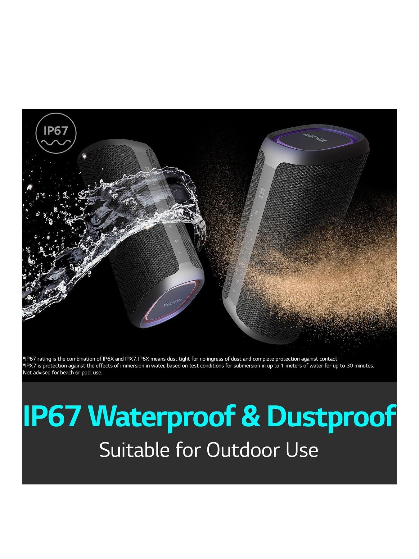 LG XBOOM Go is ready to crank the outdoors thanks to IP67 water and dust resistance, so you never have to worry about keeping the music going.
