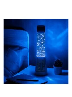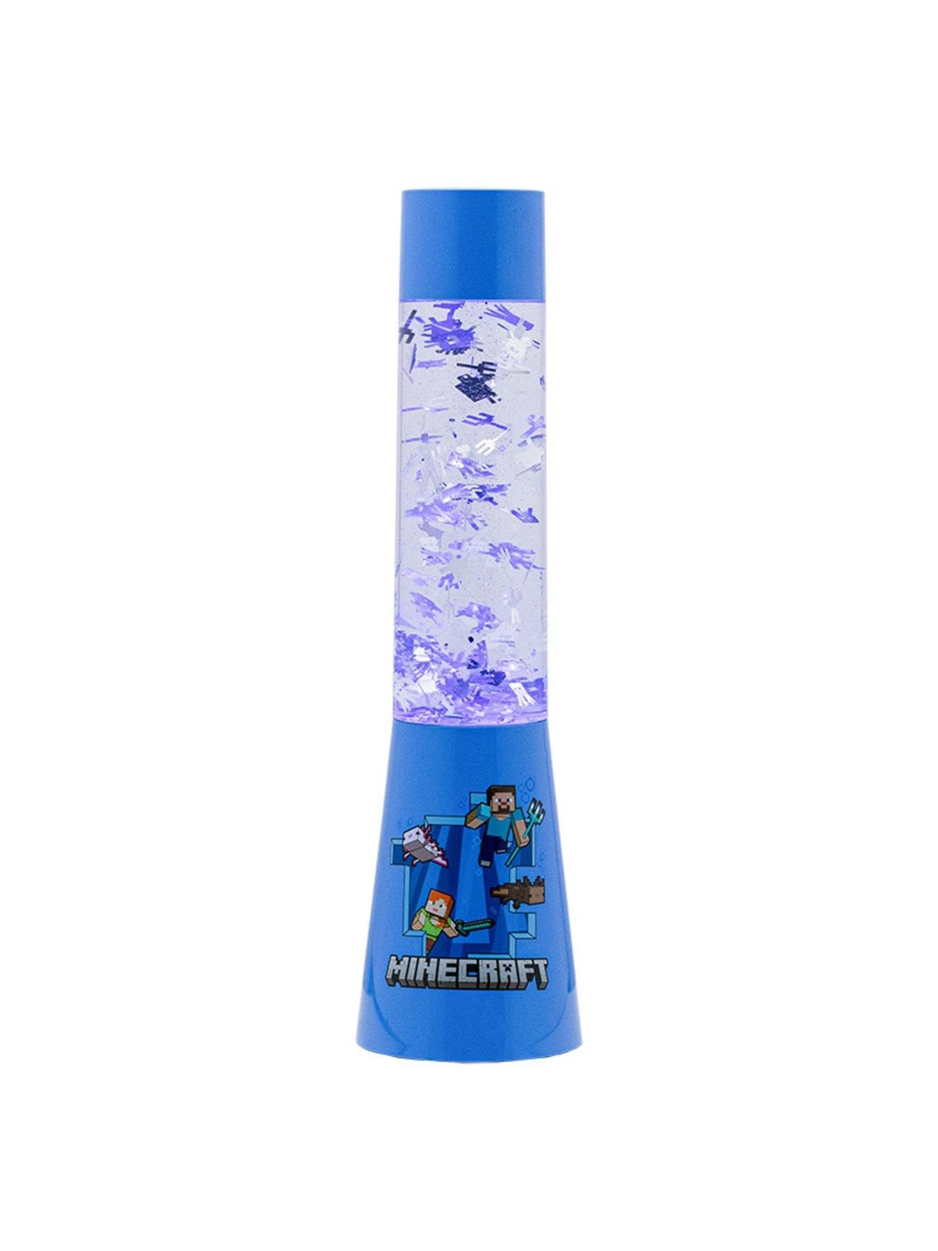 The 33cm (13″) tall plastic lamp is filled with flowing silver foil shapes and glitter. Turn the light on to watch the foil Axolotl, Turtle, Guardian, Trident and Squid mobs float around while casting a blue, shimmering glow of their aquatic adventures across your room.