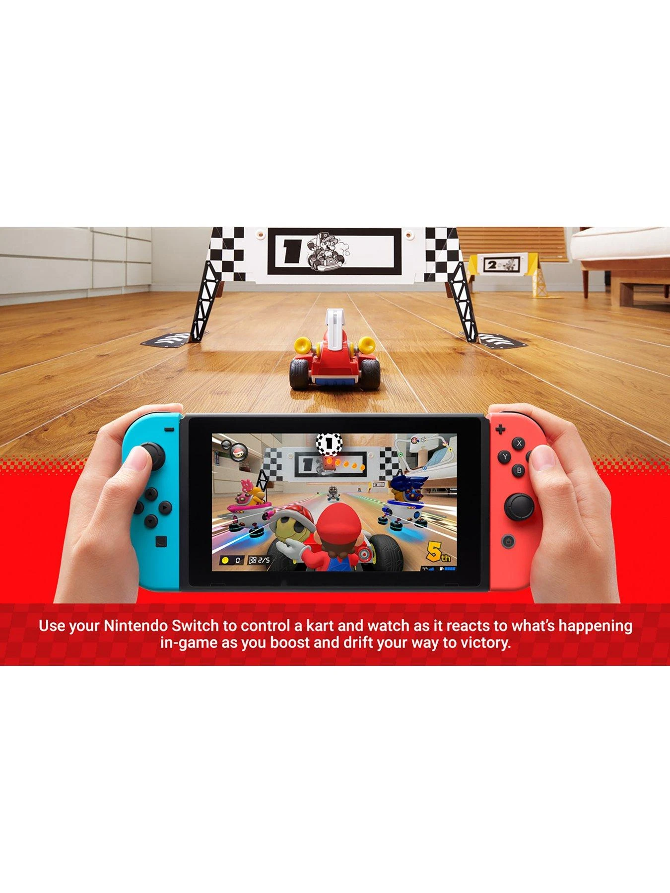 Drive a kart in the real world using familiar Mario Kart controls and see the action from your kart’s on-board camera displayed on your Nintendo Switch or TV screen. Watch as your home is transformed into ocean depths, a sandy desert and more from the world of Mario Kart!
