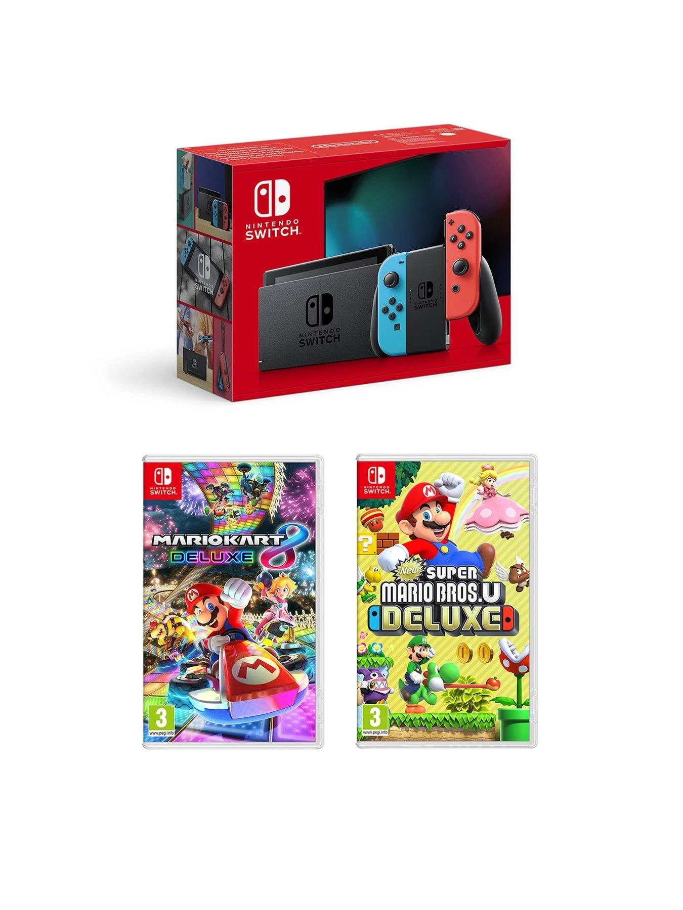 Nintendo Switch Neon Console with Mario Kart 8 & New Super Mario Bros U Deluxe – hilarious sharing fun for all.