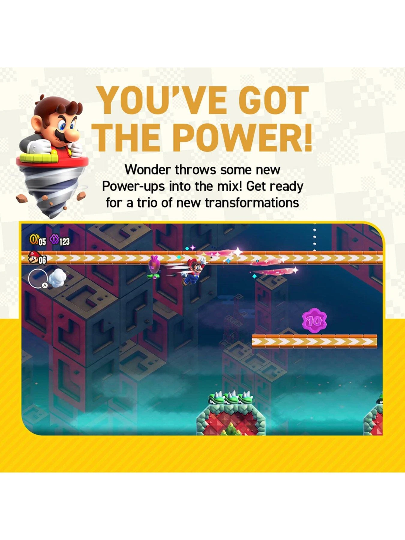 Step into a world of wonder in Super Mario Bros. Wonder for Nintendo Switch!Classic Mario side-scrolling gameplay is turned on its head with the addition of Wonder Flowers! These game-changing items trigger spectacular moments you have to see to believe. Witness pipes coming alive, wreak havoc as a giant spiky ball, and see even more unexpected events called Wonder Effects.Pick from heroic Super Mario characters and Power-Ups Choose from familiar characters including Mario, Luigi, Peach, Daisy, Yoshi and Toad. Transform into Elephant Mario to use your trunk to trounce enemies with a surprising new Power-Up! Share the wonder with friends and Mario fans .Team up with up to three friends locally and gather around one Nintendo Switch console to experience the game-bending Wonder Effects together as you tackle courses as a team, and help each other on your way to the goal.
