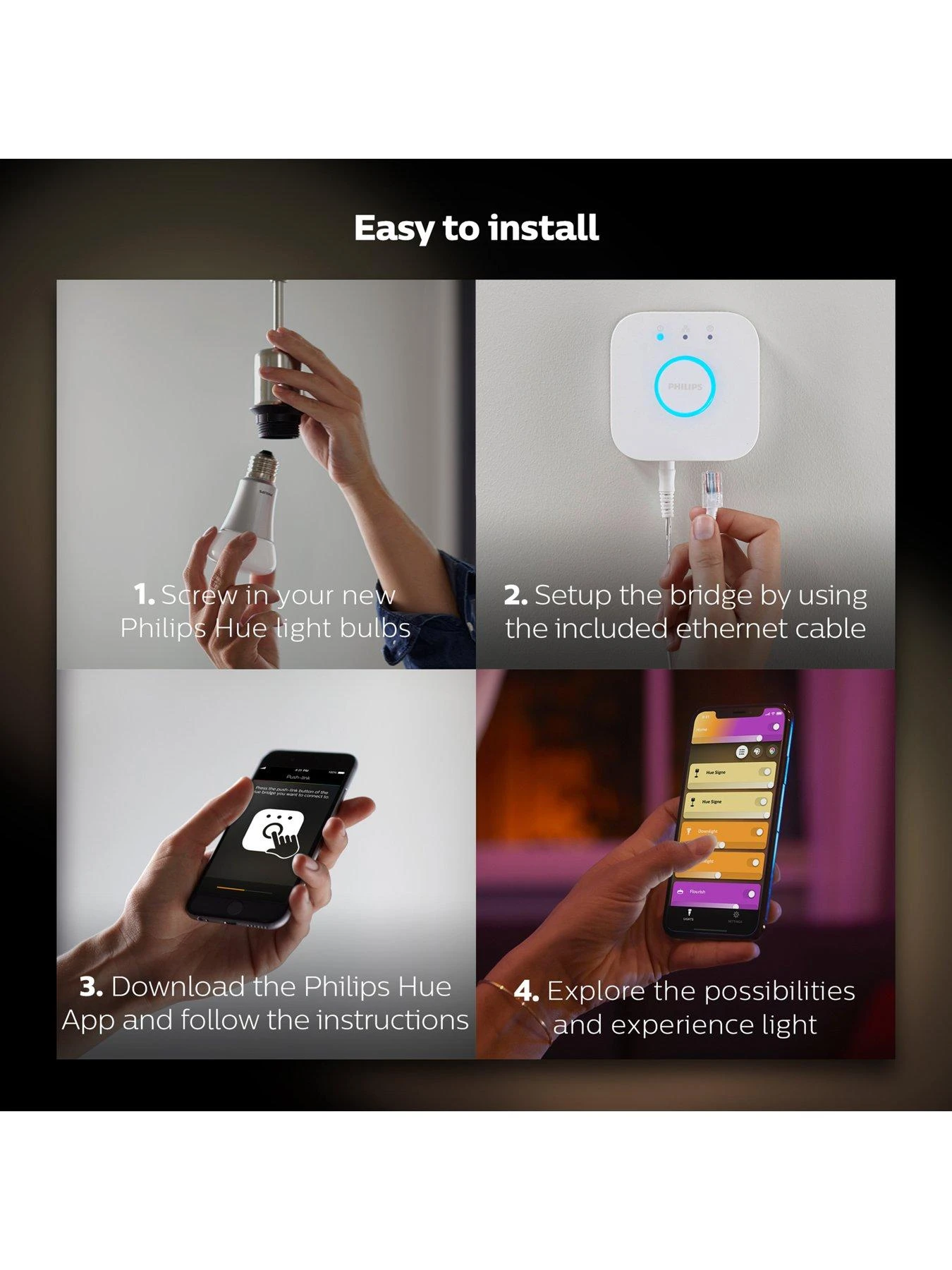 Add ambient colour to any room with the Philips Hue White and Colour Ambiance B22 Starter Kit. Connect to the included Hue Bridge to take advantage of the endless list of features. Control via the app, voice or any smart accessory.