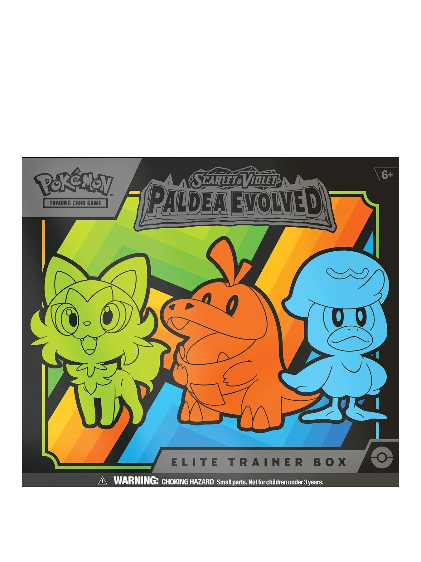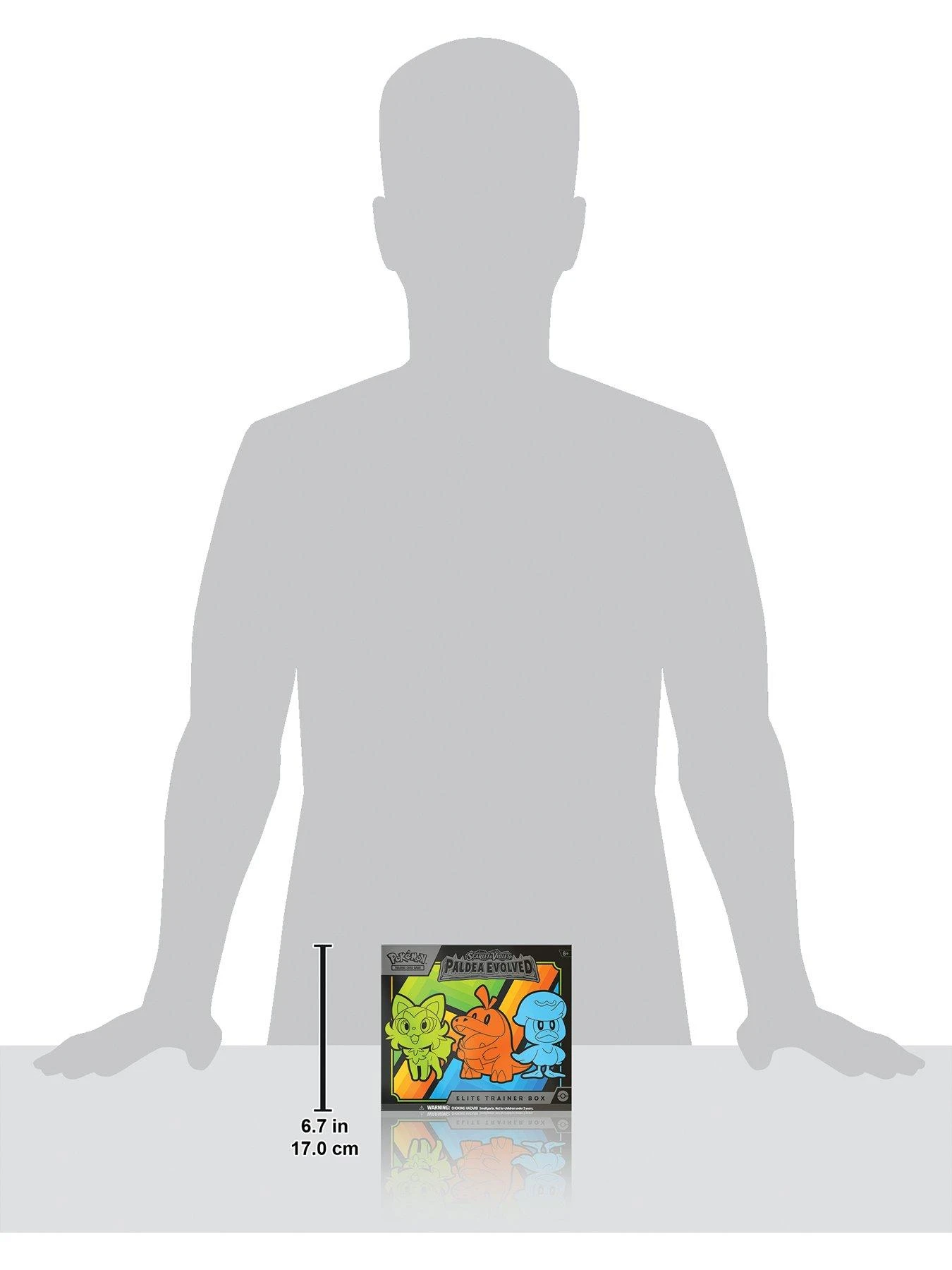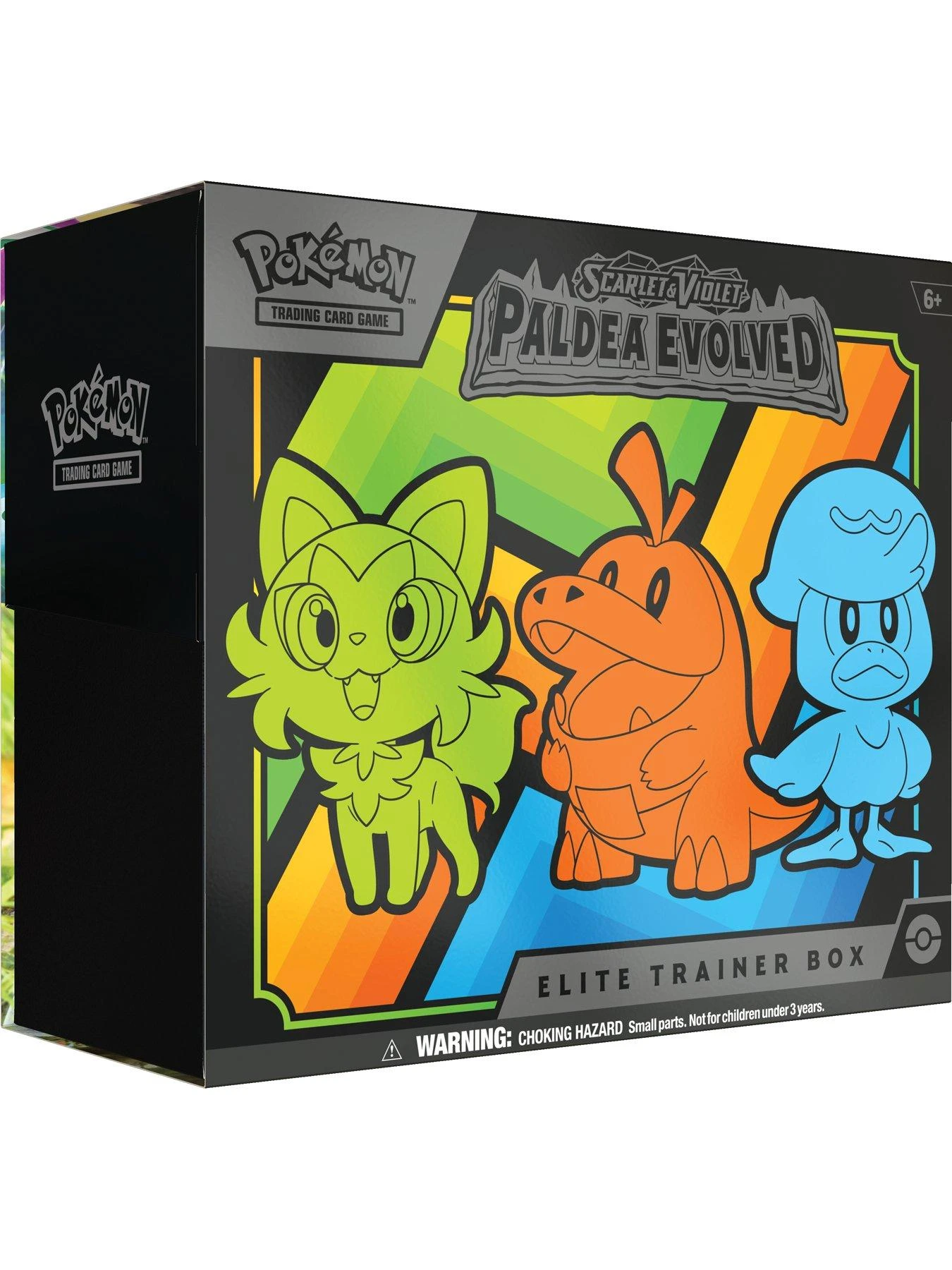 The Pokémon TCG: Scarlet & Violet-Paldea Evolved Pokémon Center Elite Trainer Box includes: 11 Pokémon TCG: Scarlet & Violet-Paldea Evolved booster packs (Each booster pack contains 10 cards and 1 Basic Energy. Cards vary by pack.); 1 full-art foil promo card featuring Pikachu with a Pokémon Center logo; 1 full-art foil promo card featuring Pikachu; 65 card sleeves featuring Sprigatito, Fuecoco, and Quaxly; 45 Pokémon TCG Energy cards; A player’s guide to the Scarlet & Violet-Paldea Evolved expansion; 6 damage-counter dice; 1 competition-legal coin-flip die; 2 plastic condition markers; A collector’s box to hold everything, with 4 dividers to keep it organized; and a code card for Pokémon Trading Card Game Live.