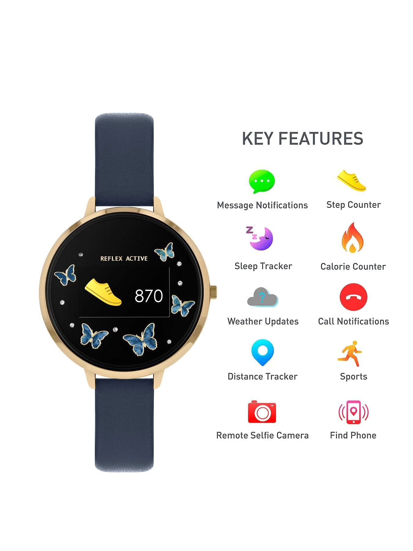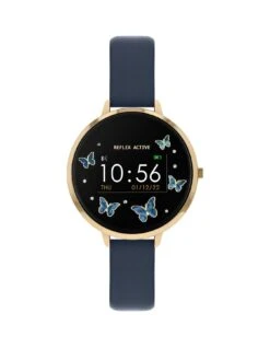 Reflex Active – The smartest smart watch! Introducing Reflex Active Series 3 smart watch with colour screen, crown navigation and up to 7 day battery life. Features include: receive calls and social media notifications, read messages and emails, track specific activities (running/walking/cycling/climbing) in real time, distance/steps/calorie tracking, live weather updates from your watch, selfie camera control, find your phone function, track your sleep, alarm and reminders. Navy PU Strap and a round polished gold colour case with blue butterly design dial and clear china stone detail. Each watch is packed in a Reflex Active presentation gift box complete with instruction manual, USB charger (sealed rechargeable battery) and 1 year manufacturer guarantee. Scratch Resistant and Splashproof only. Download the free Reflex Active App now to explore in more detail. IOS and Android Compatible & Compatible with apps from the Google play store.