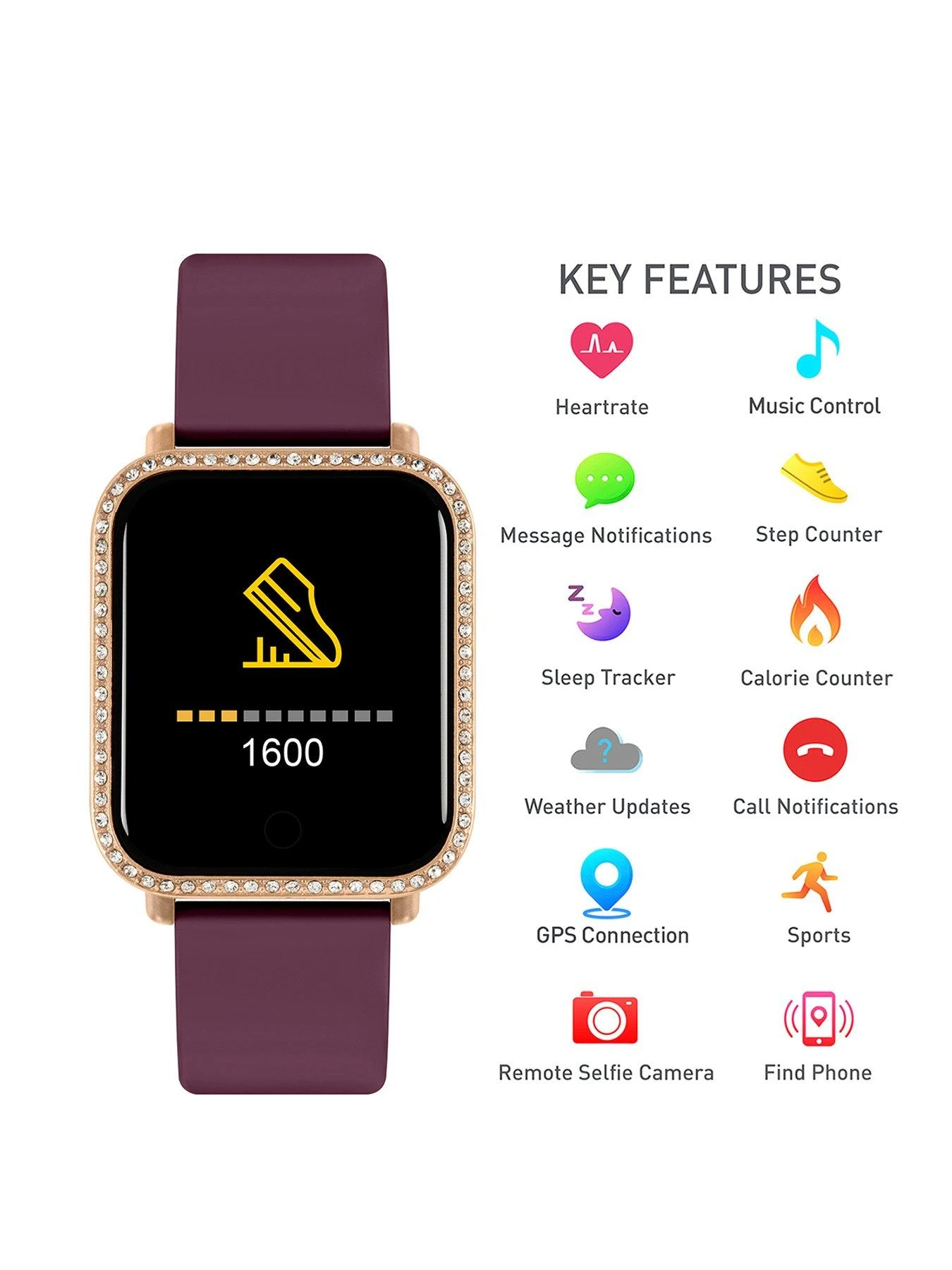 Reflex Active – The smartest smart watch! Introducing Reflex Active Series 6 smart watch with heart rate monitor, music control, colour touch screen and up to 7 day battery life. Features include: receive message notifications, track specific activities (running/walking/cycling/climbing) in real time, distance/steps/calorie tracking, live weather updates from your watch, selfie camera control, find your phone function, track your sleep, alarm and reminders. Rectangular rose gold Stone set case with Berry Silicone strap. Each watch is packed in a Reflex Active presentation gift box complete with instruction manual, USB charger (sealed rechargeable battery) and 1 year manufacturer guarantee. Splashproof only. Download the free Reflex Active App now to explore in more detail. IOS & Android Compatible.