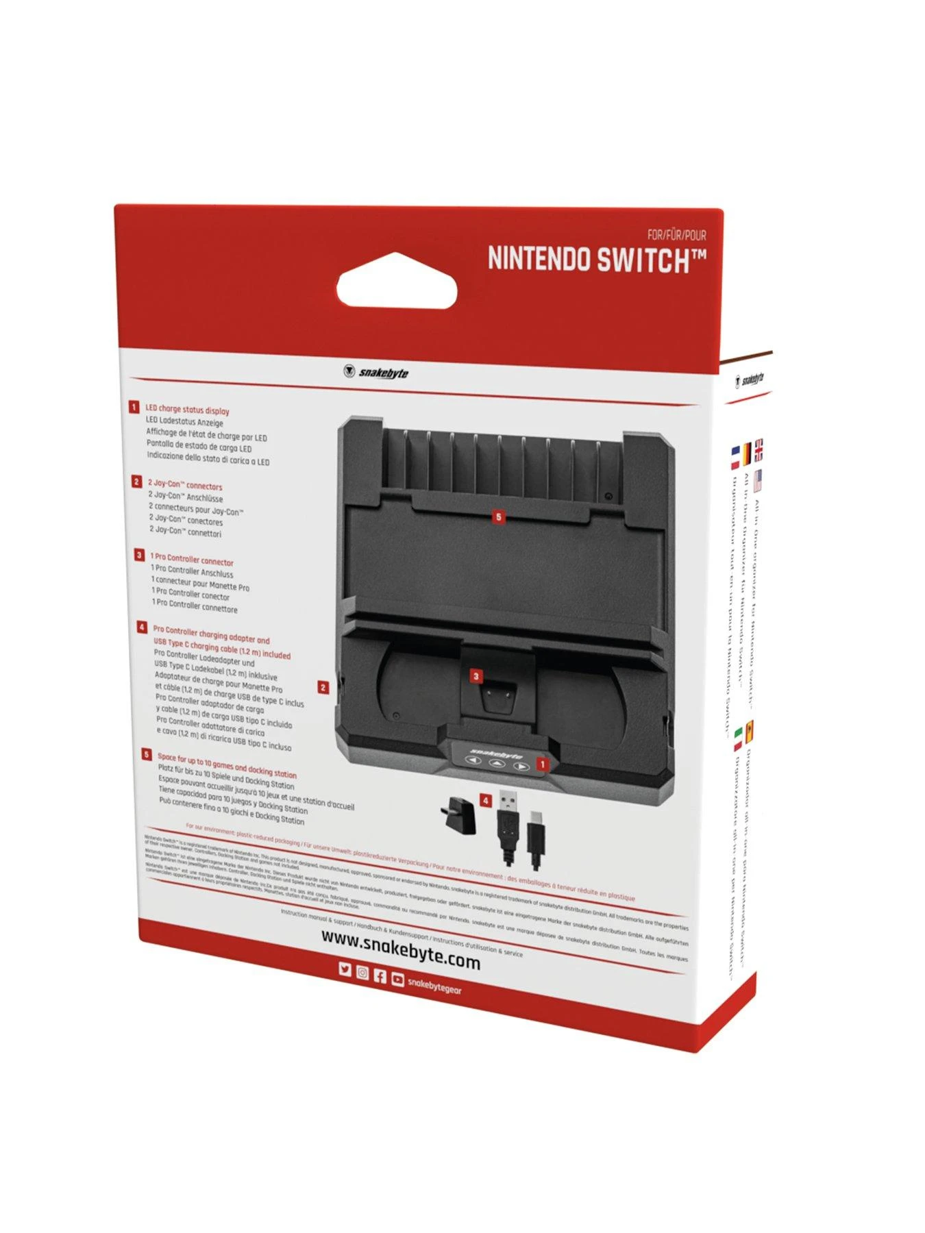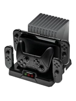 Functional charging and storage station for Nintendo Switch. Charge up to 2 Joy-Con controllers and one Pro Controller simultaneously when placed in the dedicated docking ports.