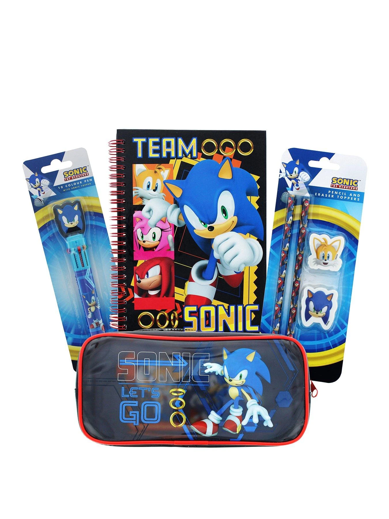 This Sonic Stationery Pack is bursting with action! It includes a A5 Notebook with Sonic on the front cover. Write in the Notebook with the 2 x Pencils and Pen with 10 different coloured inks and a Sonic shaped topper! Easily wipe out any mistakes with the 2 x shaped Erasers. All Pens and Pencils can be safely packed away in the Pencil Case.