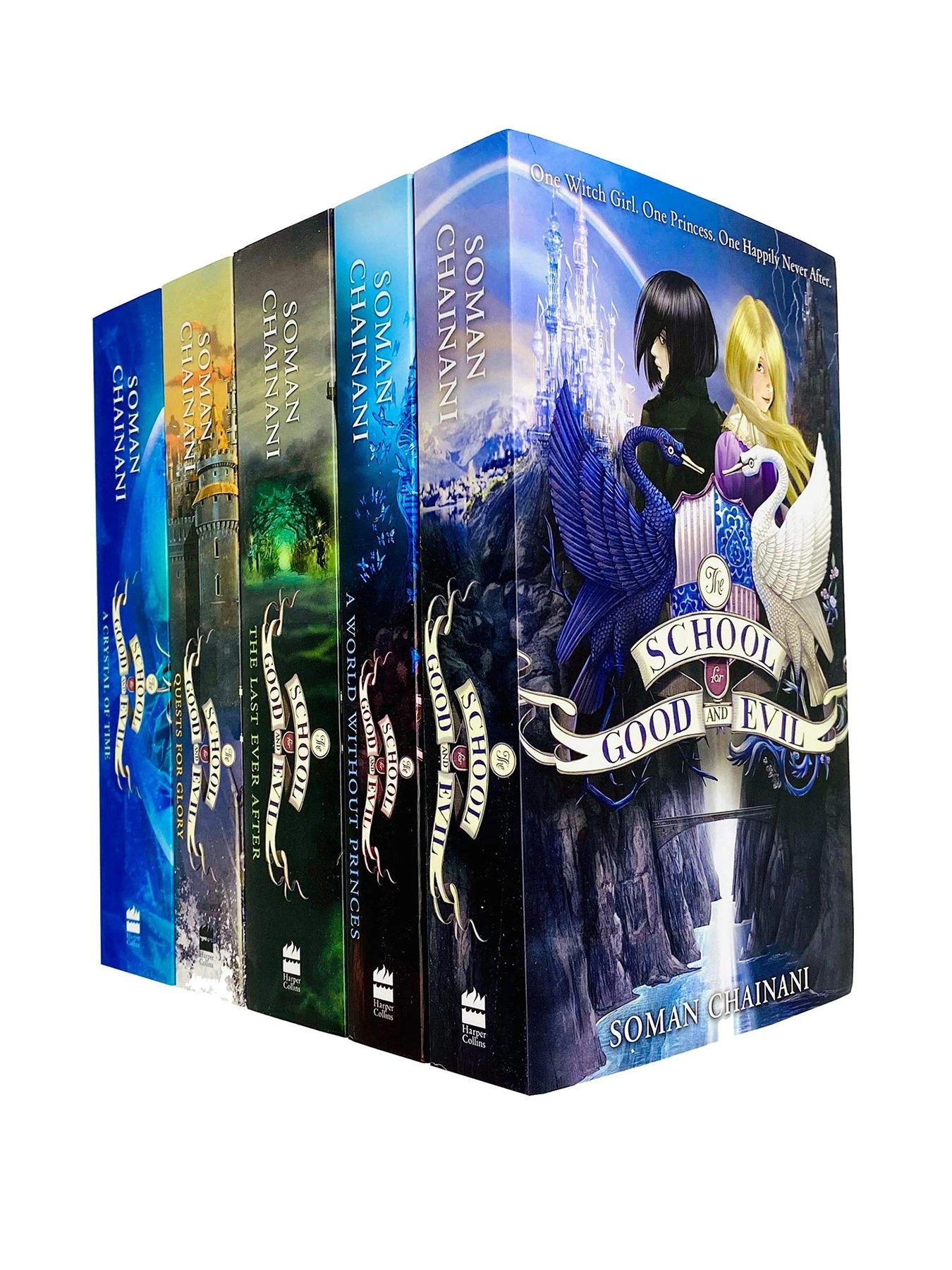 The School for Good and Evil Book Series Books 1 – 5 Collection Set by Soman Chainani: contains the following 5 books. The School for Good and Evil: Every four years, two girls are kidnapped from the village of Gavaldon. Legend has it these lost children are sent to the School for Good and Evil, the fabled institution where they become fairytale heroes or villains.With her glass slippers and devotion to good deeds, Sophie knows she’ll join the ranks of past students like Cinderella, Rapunzel, and Snow White at the School for Good. A World Without Princes: After saving themselves and their fellow students from a life pitched against one another, Sophie and Agatha are back home again, living out their Happily Ever After. But life isn’t quite the fairytale they expected…Witches and princesses reside at the School for Girls, where they’ve been inspired to live a life without princes. The Last Ever After: Former best friends Sophie and Agatha thought their fairy tale’s ending was sealed when they went their separate ways, each in the arms of a boy. But their storybook is about to be rewritten, and, this time, theirs isn’t the only one. Quests for Glory: Before they can graduate, the students of the School for Good and Evil must complete their fourth-year Quests for Glory. The stakes are high: success brings eternal adoration, and failure means obscurity forever. A Crystal of Time: A false king has seized Camelot’s throne, sentencing Tedros, the true king, to death. While Agatha, narrowly escapes the same fate, Sophie is caught in King Rhian’s trap. With her wedding to Rhian approaching, she’s forced to play a dangerous game as her friends’ lives hang in the balance.