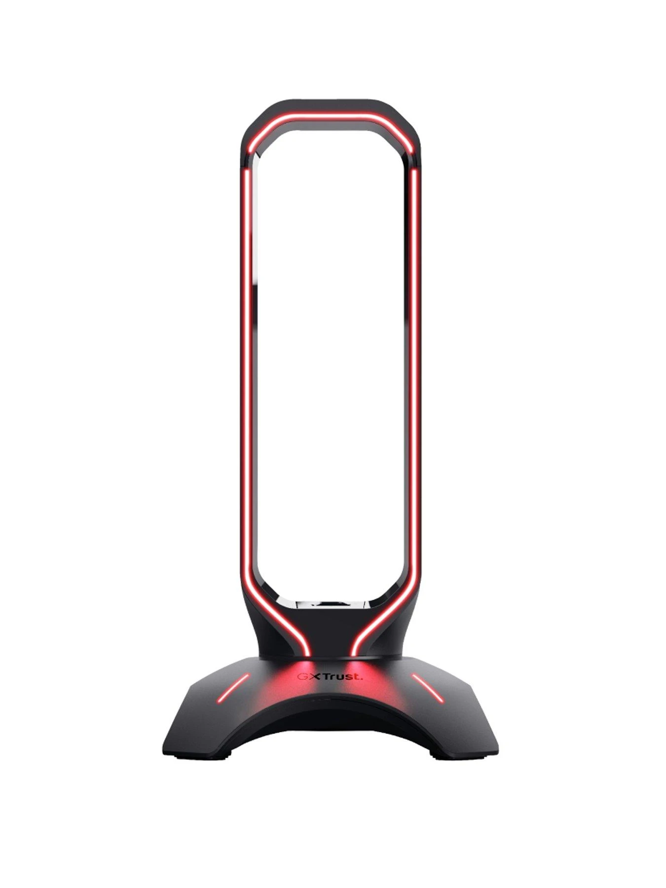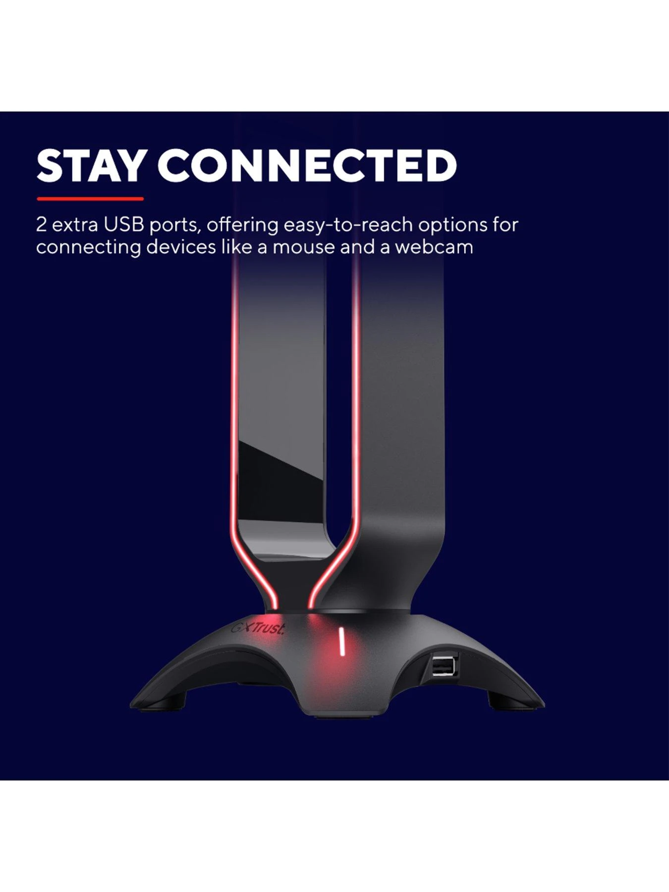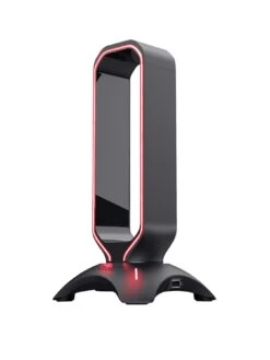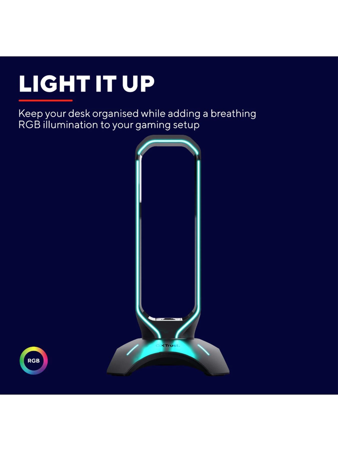 Keep your desk organised with the Trust GXT 265 Cintar RGB Headset Stand. This stylish accessory not only looks after your headset, it also has two handy USB ports and cool, breathing RGB illumination that makes a great addition to your gaming setup.