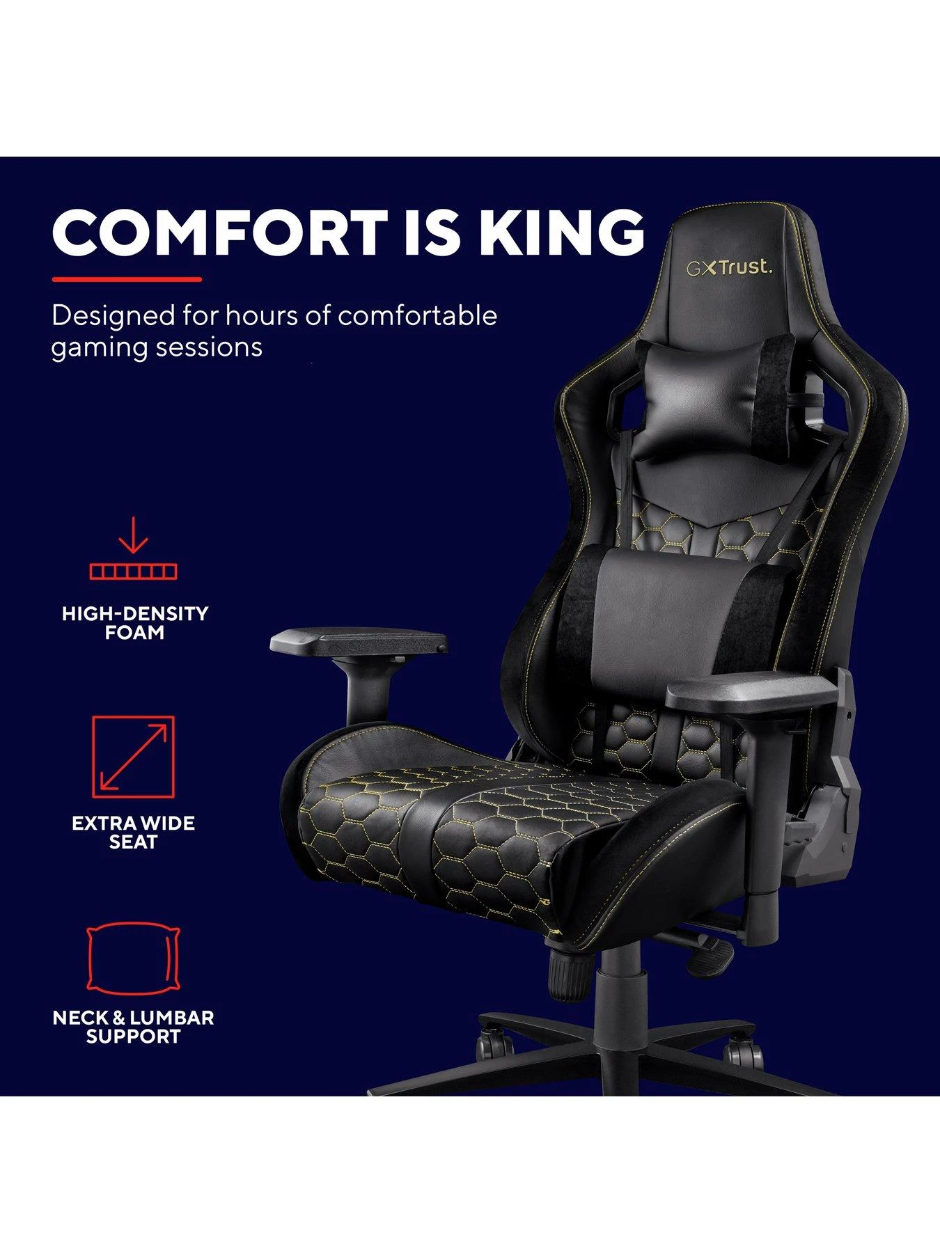 Who wants a chair to be boring? The Trust GXT712 Resto Pro is made for gaming royalty. That’s why we’ve outfitted the vegan PU leather with elegant, golden-coloured stitching and suede look-and-feel details, making this chair a thing to behold in any game room.
