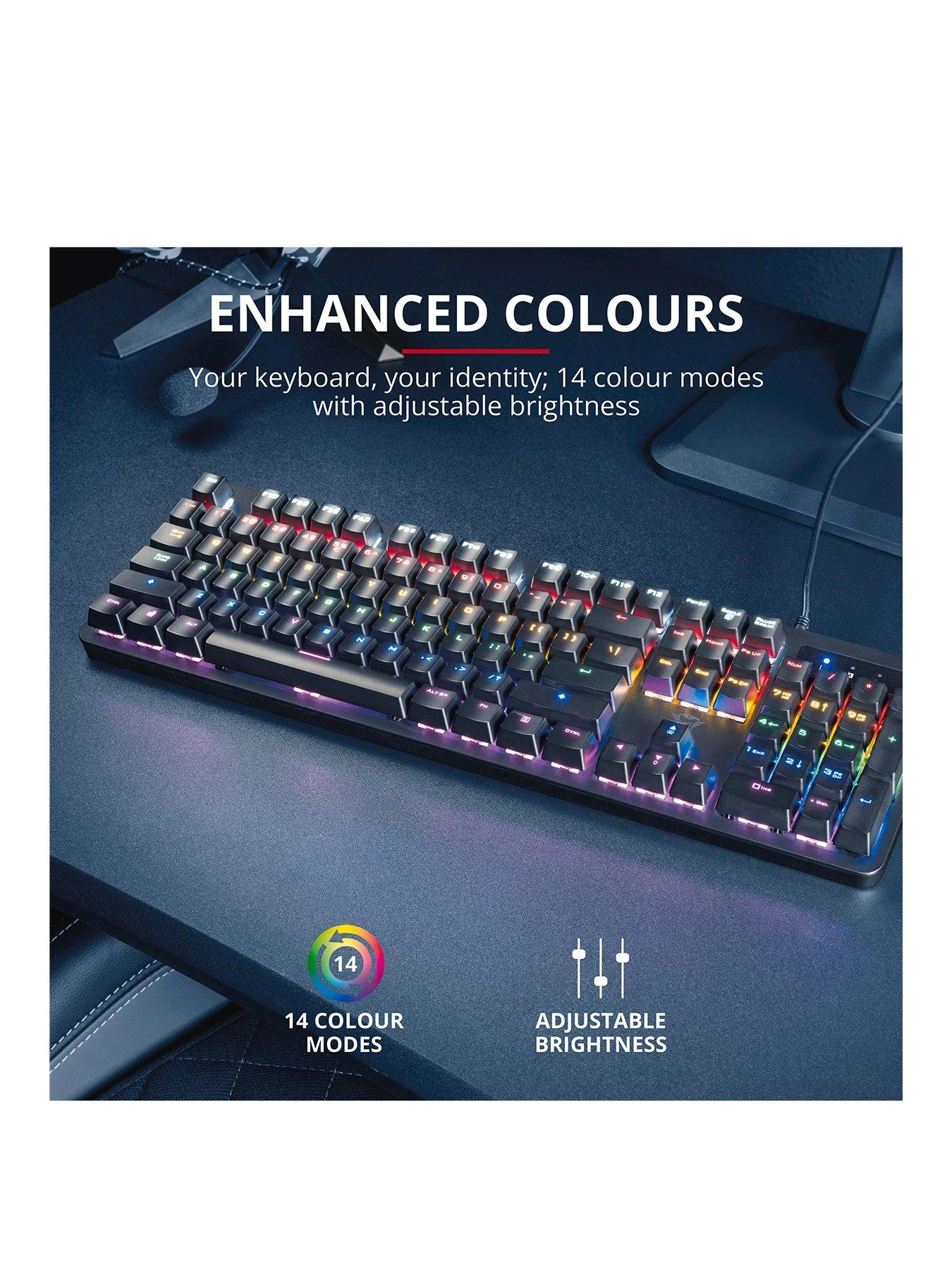 - Your keyboard, your identity; 14 colour modes with adjustable brightness