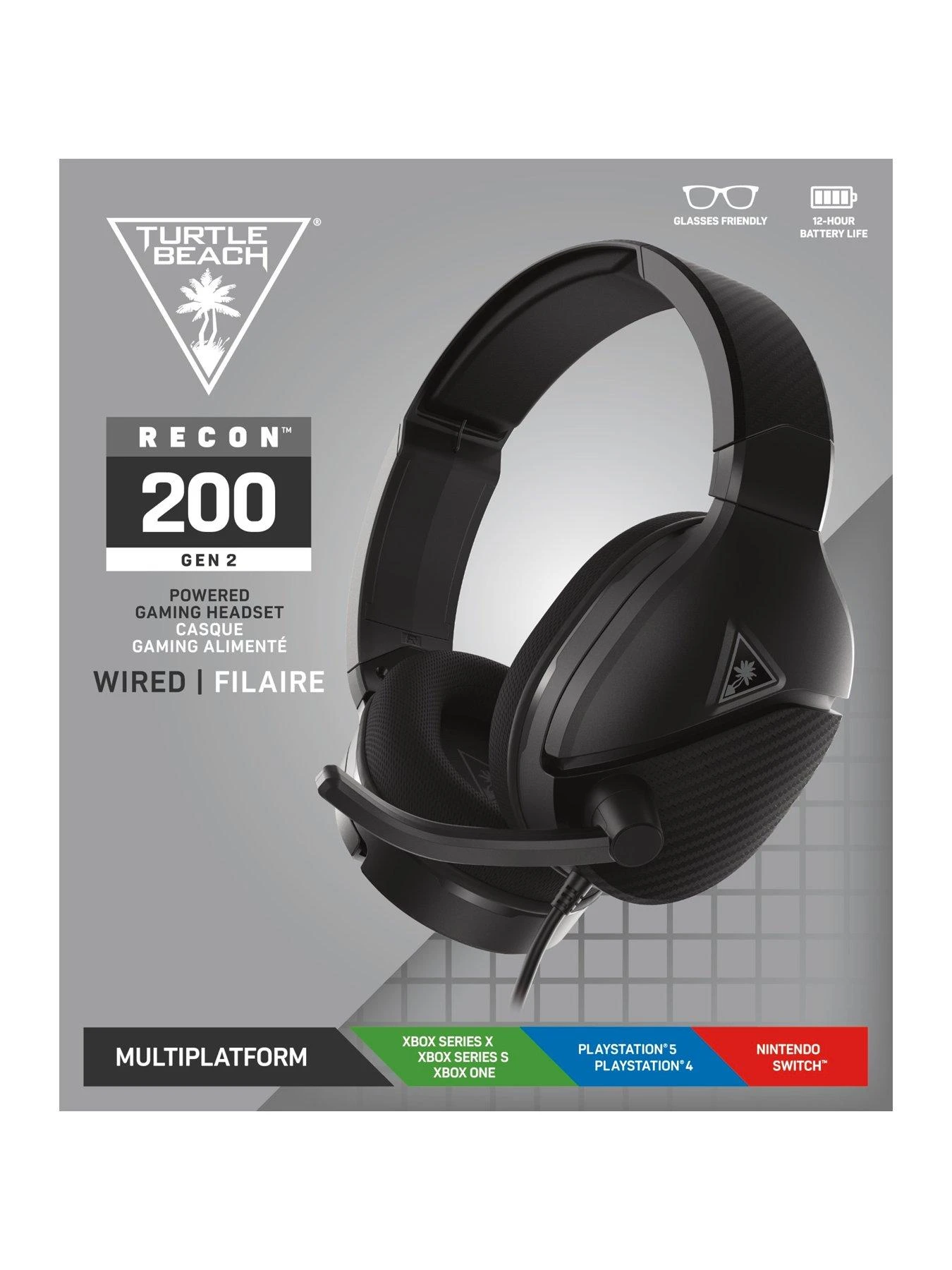 Hear Big. Win Big. with the Turtle Beach Recon 200 Gen 2 powered gaming headset. Powered by a rechargeable 12-hour battery, the Recon 200 Gen 2 delivers amplified audio with bass boost and variable mic monitoring so you can hear the volume of your voice in the headset. But we get it, 12-hours can go by quickly, so the Recon 200 Gen 2 was built to keep going without power in passive mode to support basic headset functions. Whether you’re chatting with teammates or trash-talking the enemy, the high-sensitivity flip-to-mute mic picks up your comms loud and clear. Feel next generation comfort with redesigned, ultra-soft memory foam ear cushions with ProSpecs glasses-friendly technology, wrapped in athletic fabric to keep you cool. The reinforced metal headband returns for the Gen 2, with enhanced styling and added rigidity, while maintaining its lightweight and flexible structure. With a simple flip of a switch, the Recon 200 Gen 2 works with Xbox or PlayStation consoles and more.
