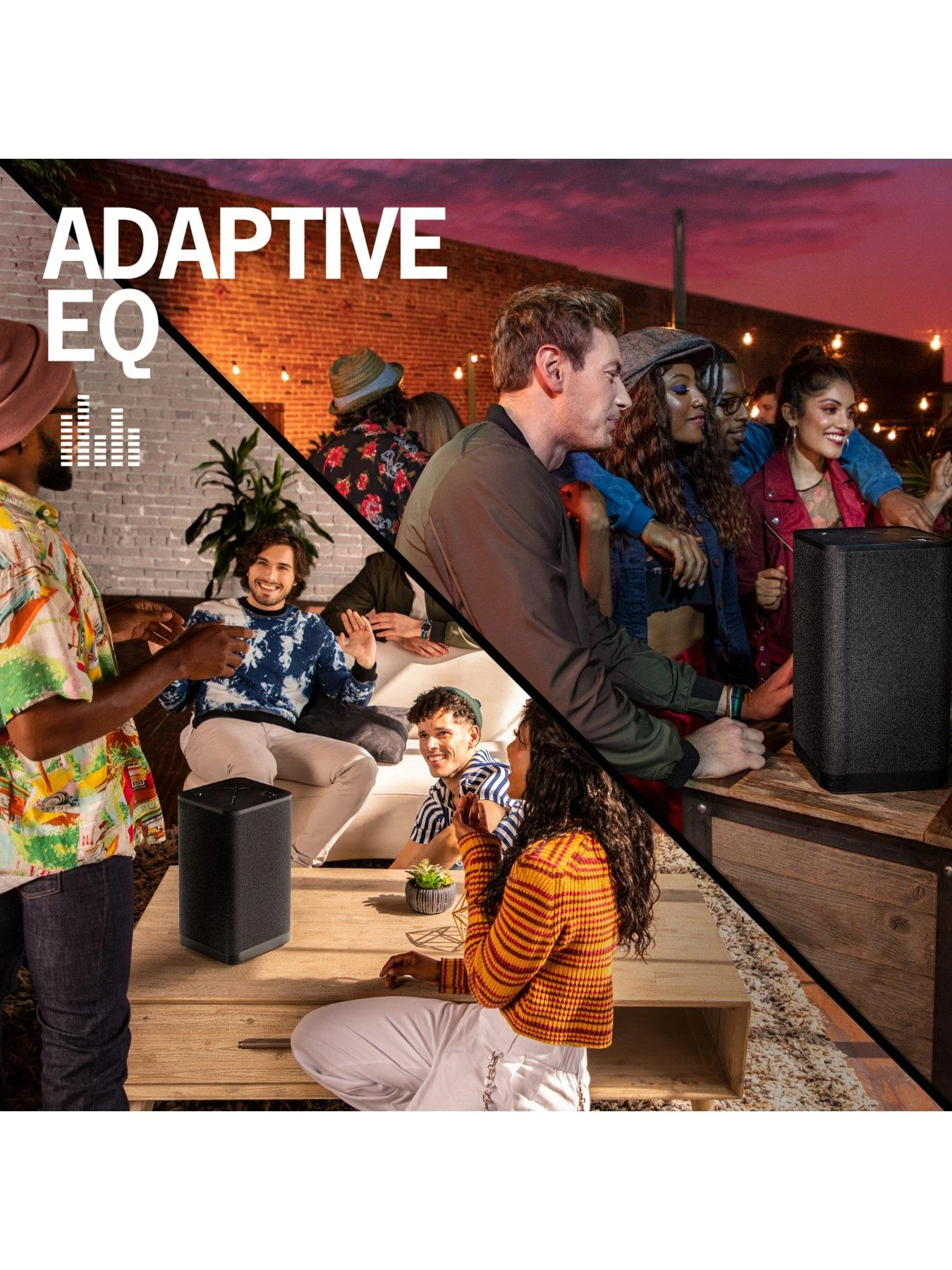 - Adaptive equalizer: This party speaker’s adaptive EQ literally reads the environment and automatically customizes the sound