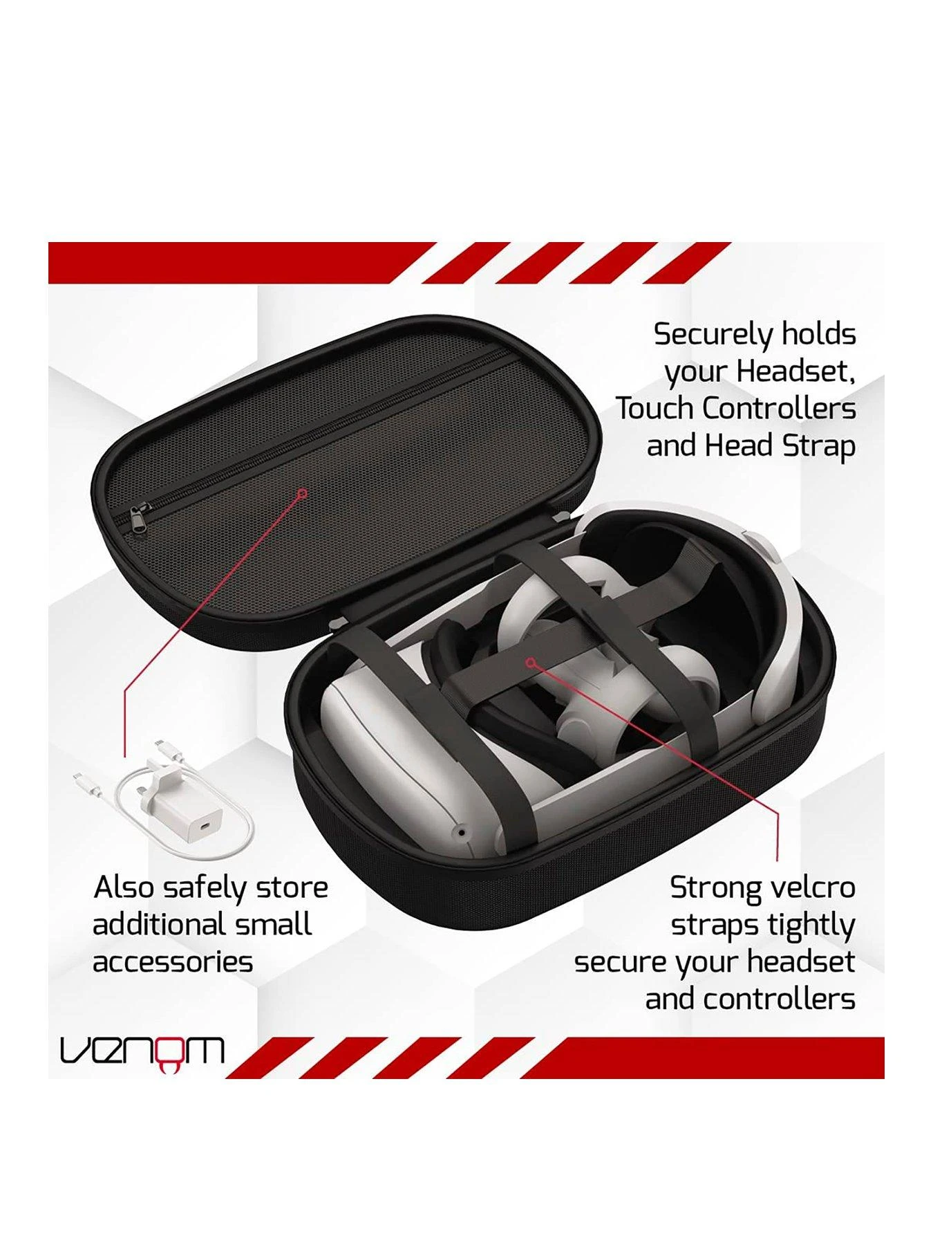 – Securely holds your Headset, Touch Controllers and Elite Head Strap plus additional small accessories such as charging and data cables