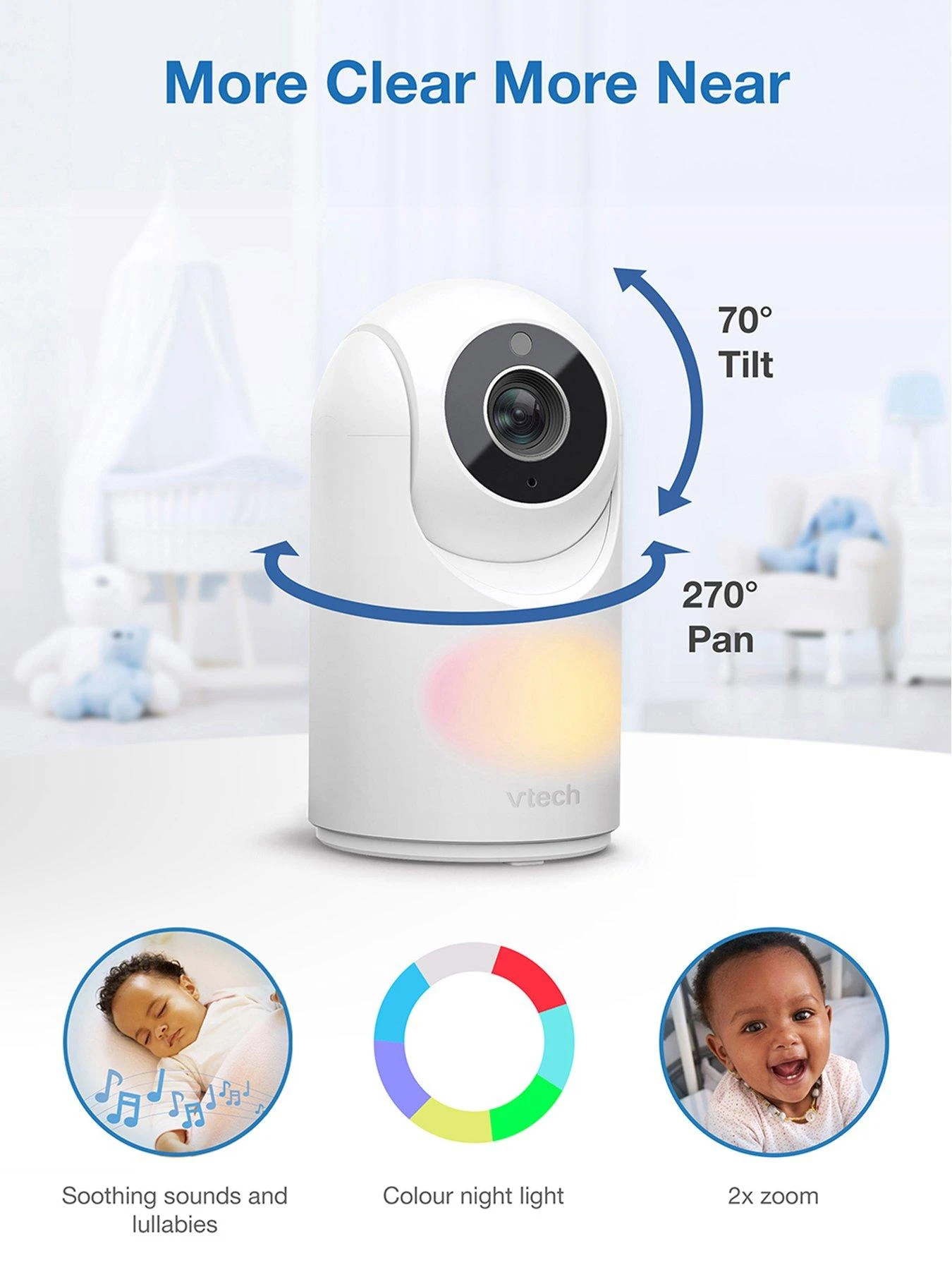 Watch as your little one moves about. The camera pans up to 270 degrees side-to-side and tilts as many as 70 degrees up and down. Need more detail? The camera zooms up to 2 times.